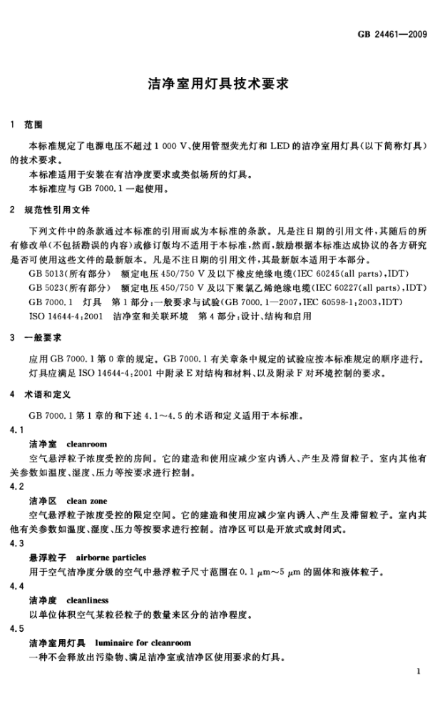 本標準規定了電源電壓不超過1000V、使用管型熒光燈和LED的潔凈室用燈具(以下簡稱燈具)的技術要求。 本標準適用于安裝在有潔凈度要求或類似場所的燈具。 本標準應與GB7000.1一起使用。