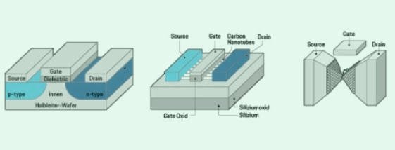 由于量子力學(xué)隧道效應(yīng),電子可以穿越絕緣體,這將使元件功能失效。人們開(kāi)始尋找一種新型晶體管,可以進(jìn)一步提高未來(lái)集成電路的性能,作為傳統(tǒng)晶體管的替代品。目前有很多研究,但還沒(méi)有領(lǐng)先者可以取代硅MOSFET。研究人員列出了一系列MOSFET替代品,包括隧道場(chǎng)效應(yīng)晶體管TFET,碳納米管場(chǎng)效應(yīng)晶體管,單原子晶體管。