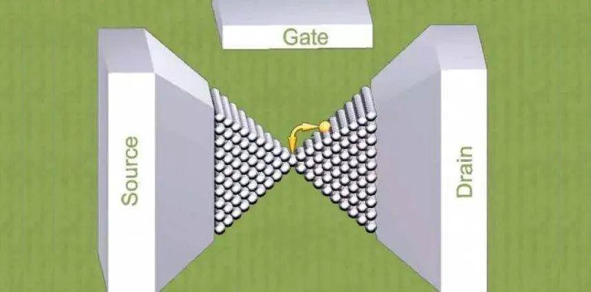 在單原子晶體管中,通過(guò)源極和柵極之間的電壓移動(dòng)單個(gè)原子,從而關(guān)閉或打開(kāi)源極和漏極之間的電路。